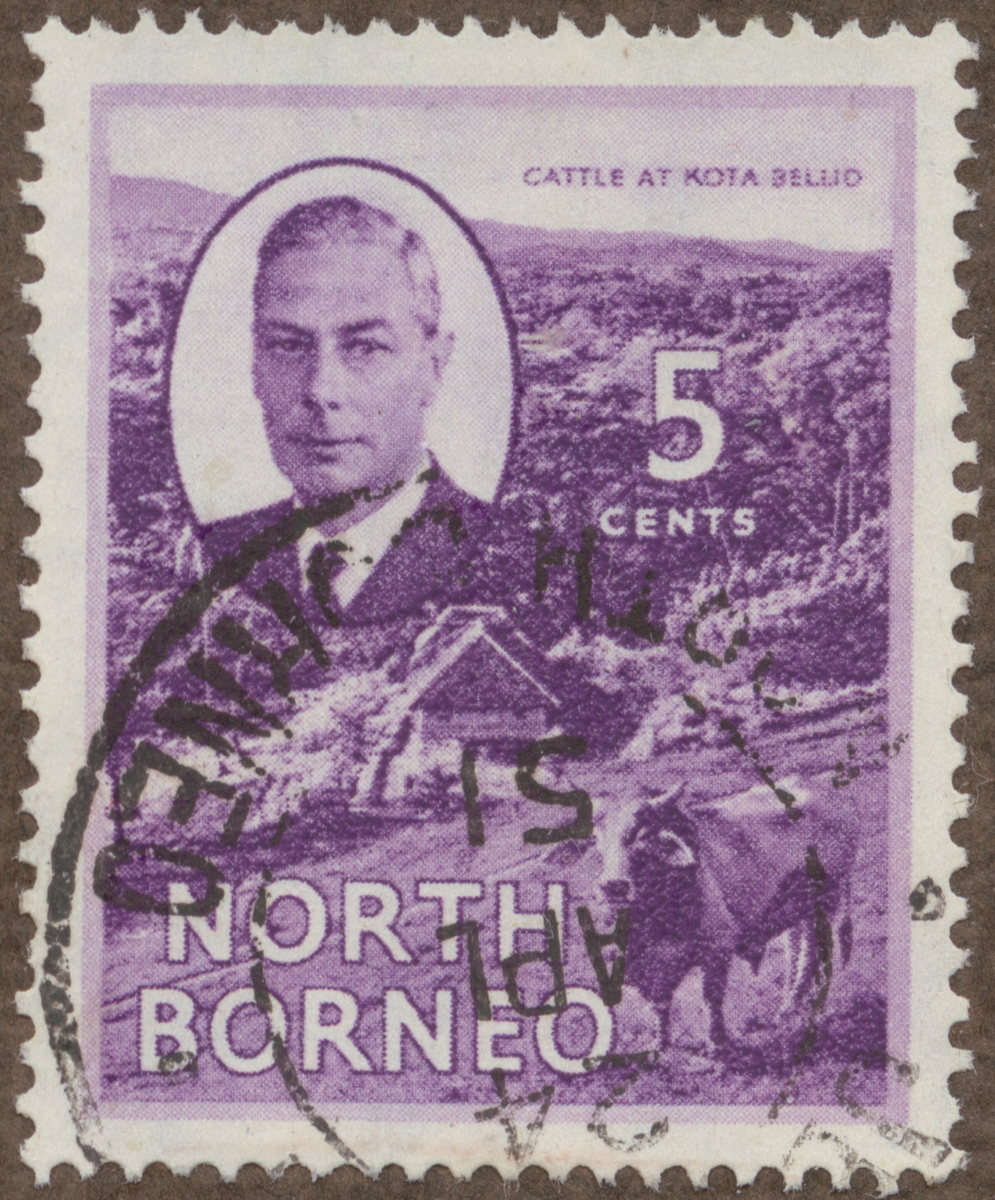 Frimärke från Nord-Borneo, 1950. Motiv av Hornboskap i Kota Belud på Nord-Borneo - (t.v.): Kung George VI-