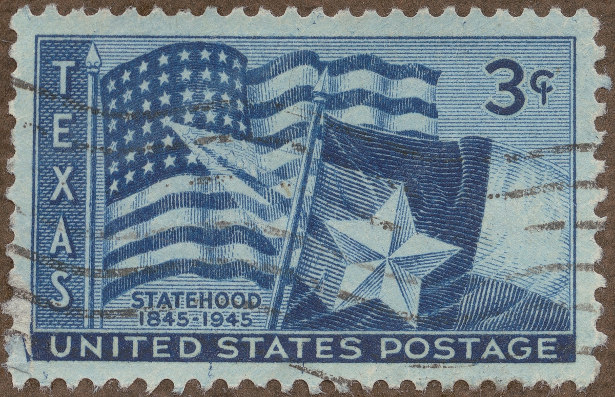 Frimärke från U.S.A., 1945. Motiv av (t.v): U.S.A:s flagga: (t.h.): Texas´ flagga ("The lone star") 100-årsminne av Texas´ vinnande av statsrättighet: 1845-1945.