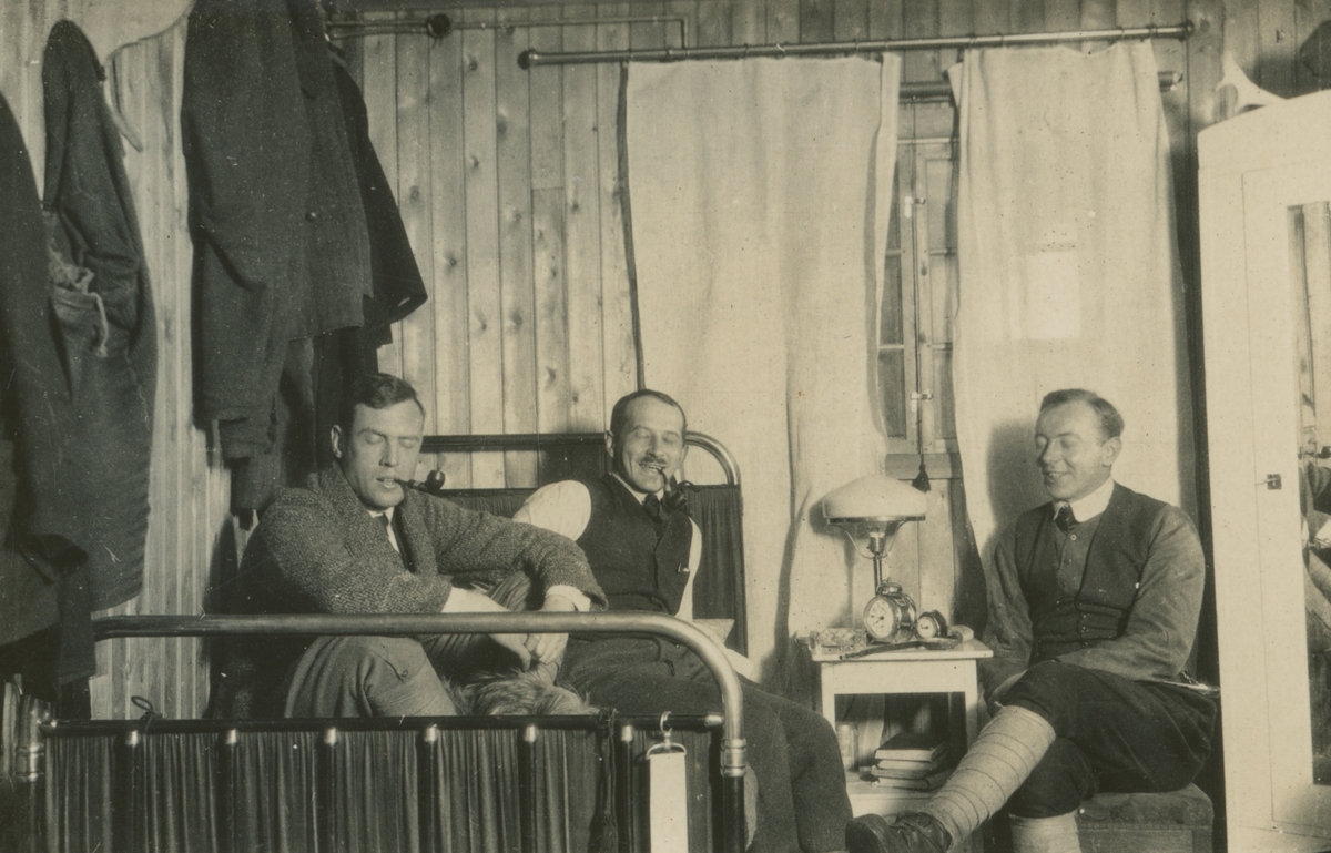 Fotografi från expedition till Spetsbergen. Motiv av tre män som umgås inomhus. Två av männen sitter i en säng och den tredje sitter i en stol. Två av dem röker pipa.