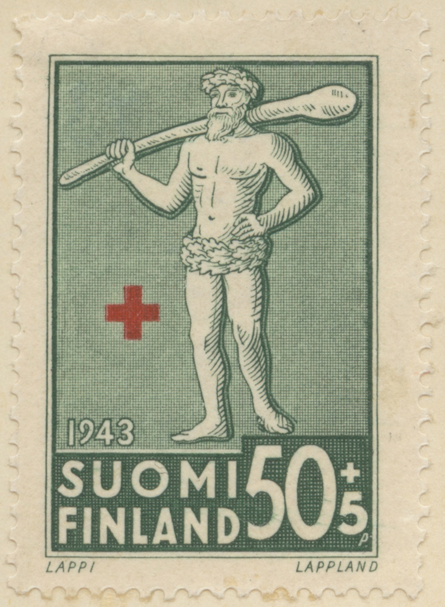 Frimärke från Finland, 1943. Motiv av "Vildman" Finska Lapplands Vapen "Serie: -Till förmån för Röda Korset-"