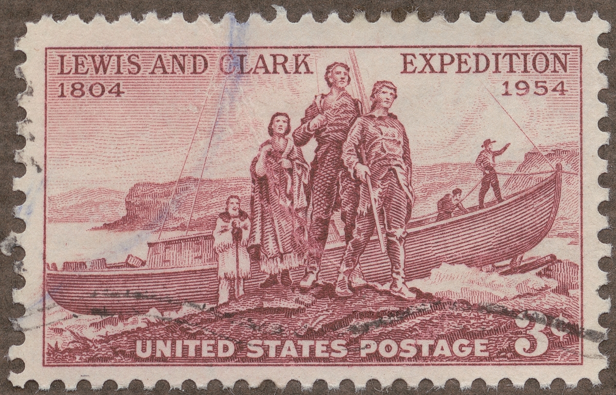 Frimärke från U.S.A., 19354. Motiv av Landstigning vid Missourifloden av de två upptäcktsresande Lewis och Clark. (i bakgrunden): Shoshone urfolksamerikanflickan Sacagawea och hennes make, fransk-kanadensaren Charbonneau, guider. 150-årsminne av Lewis och Clark expeditionen: 1804-1954.
