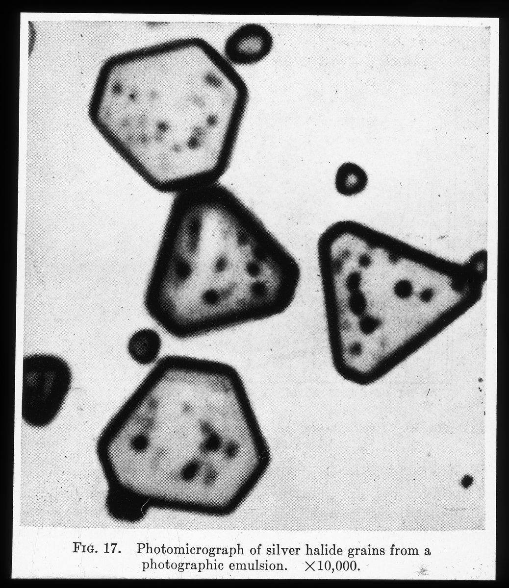 Mikrofotografi av silverhalogenidkorn från en fotografisk emulsion.