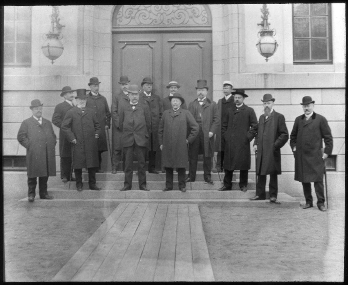 Skioptikonbild från institutionen för fotografi vid Kungliga Tekniska Högskolan. Motiv föreställande herrsällskap på trappa.. Bilden är troligen tagen av John Hertzberg under en resa i Sverige.