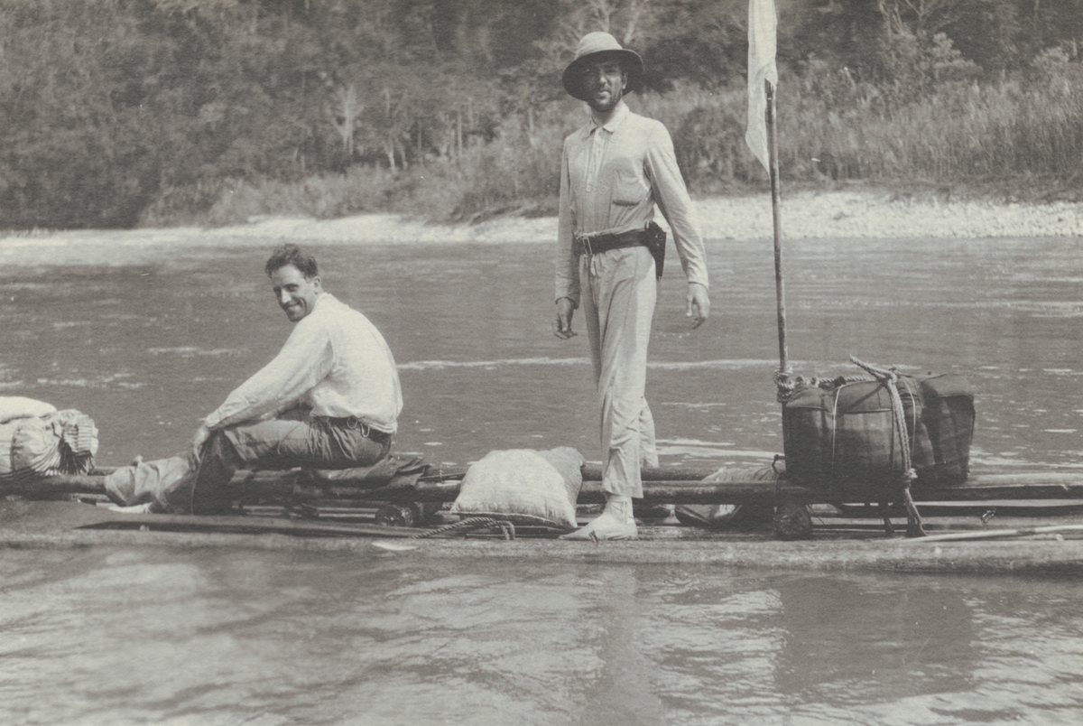 Fotografi från kuvert märkt med "Ernst Nordenskjöld". Motiv av expeditiondeltagare på flotte i flod i djungel.