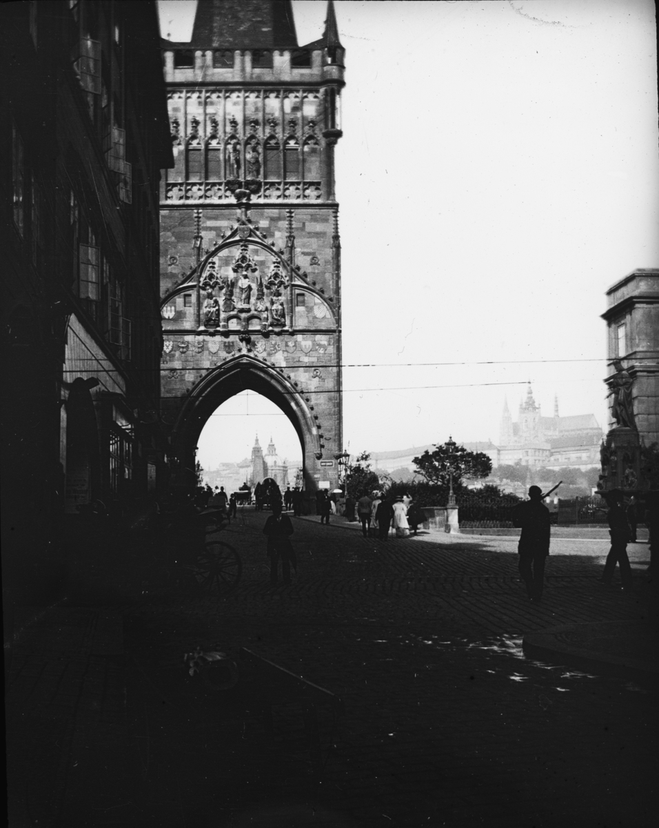 Skioptikonbild med motiv Turm Altstadt, torn vid Gamla Stan vid Karlsbron, Prag.