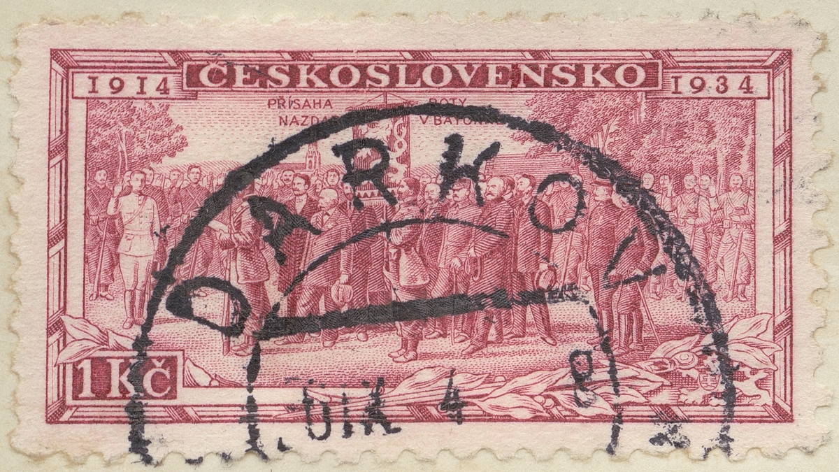 Frimärke från Tjeckoslovakien, 1934. Motiv av "Nazdar": den första tjeckoslovakiska legionen, mottagar kompanifanan i Bayonne 1914. -20-årsminne av legionerna: 1914-1934.