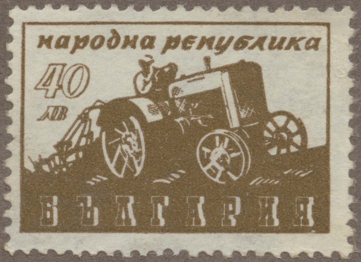 Frimärke från Bulgarien, 1947. Motiv av Jordbrukstraktor i arbete i Bulgarien 1947.