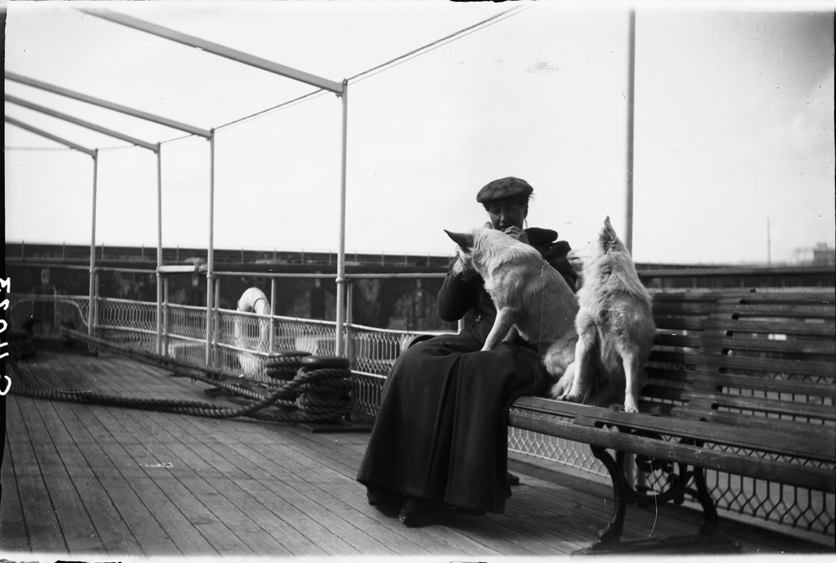 Drottning Victorias bilder. Kvinna sittande på båt med två hundar.