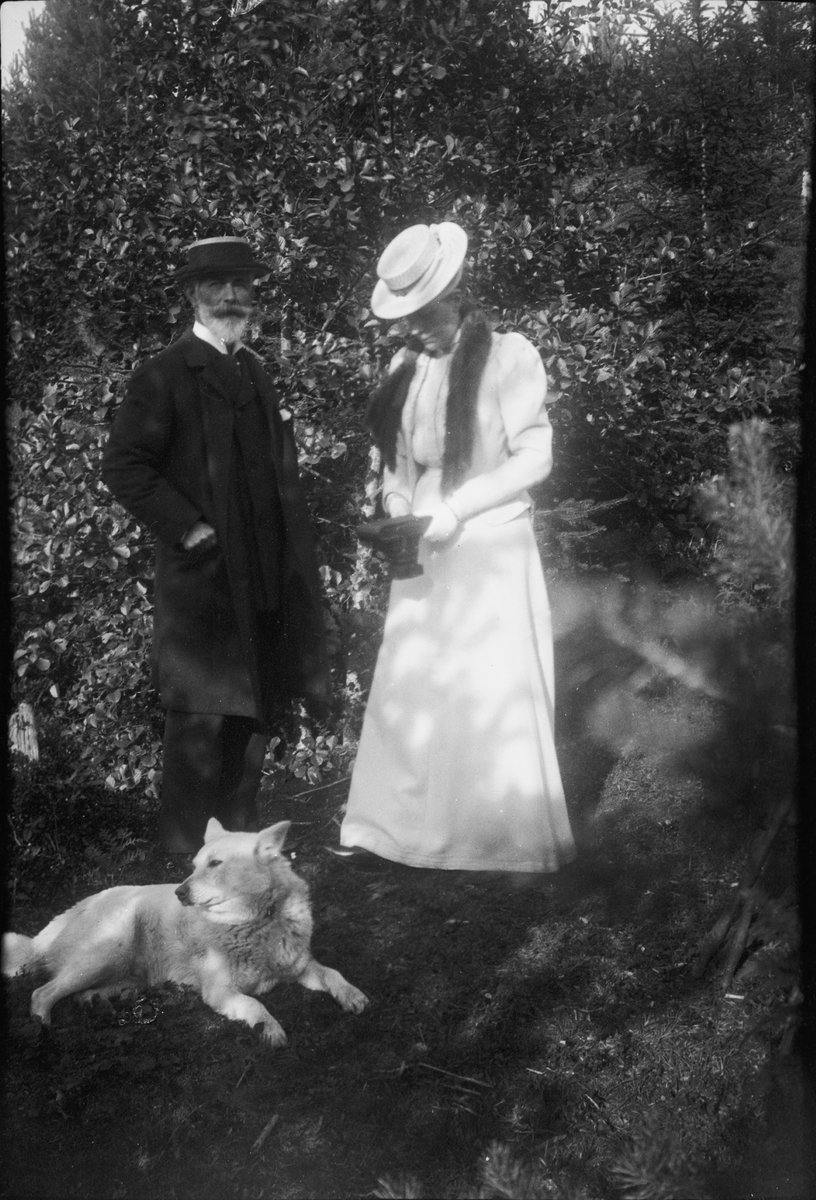 Drottning Victorias bilder. Man och kvinna i trädgård, med hund.
