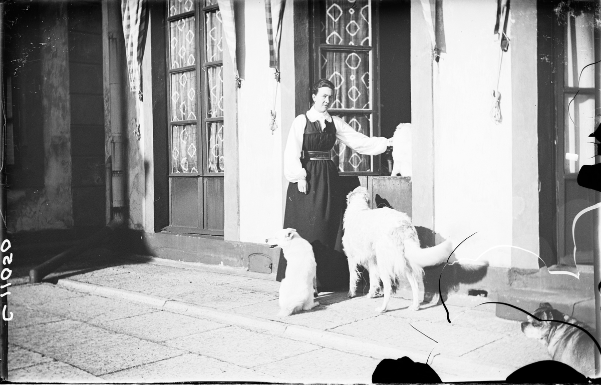 Drottning Victorias bilder. Drottning Victoria i Tullgarnsdräkt med tre hundar. Tullgarns slott.