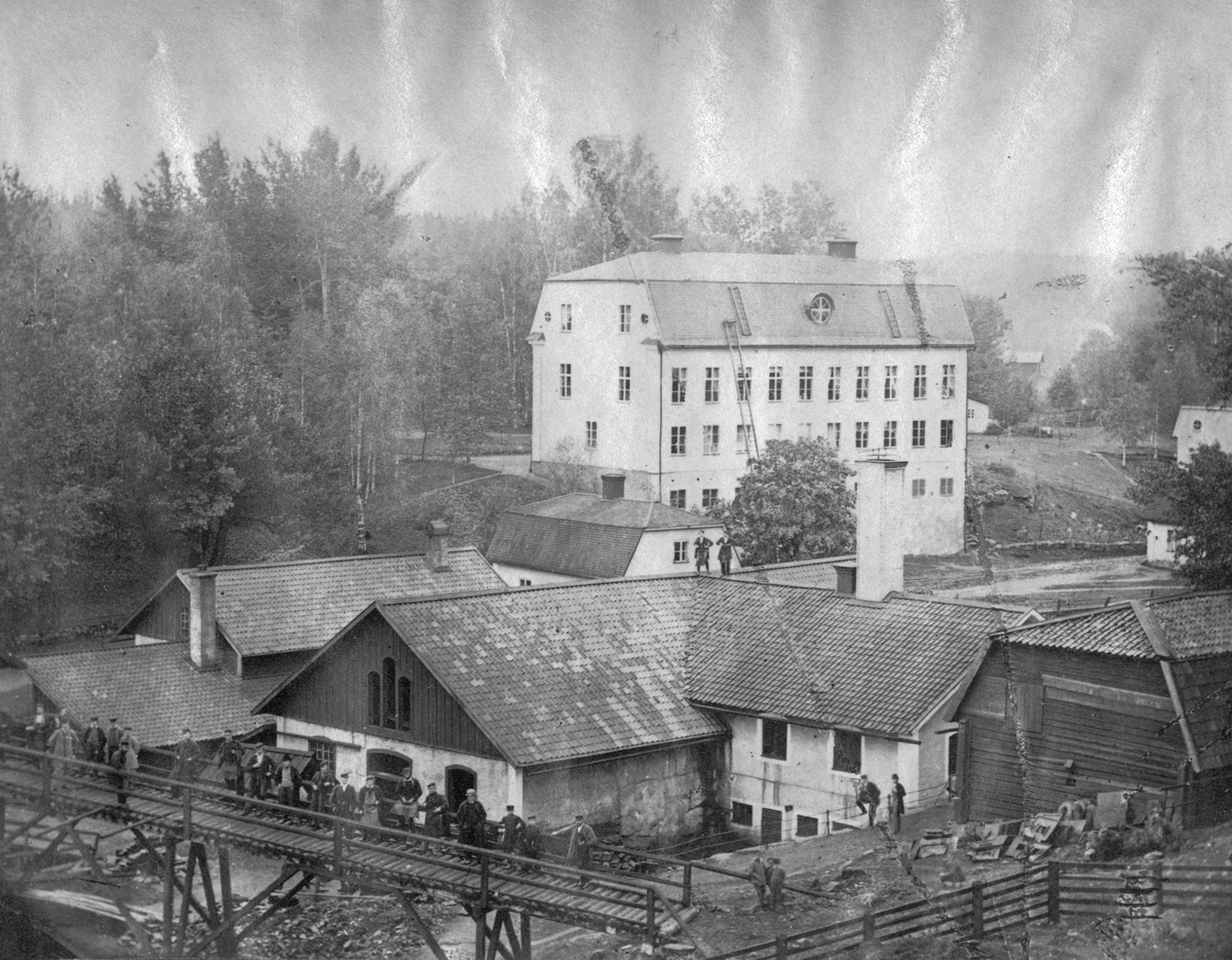 Övre Bruket. Foto från nordost, omkring 1870. Längst till höger står bokhållarna Elffors och Bjurling och längst till höger på kolhusbron skogvaktare Pettersson. >>
