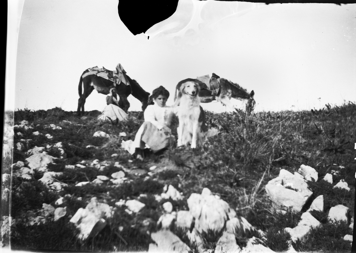 Drottning Victoria bilder. Flicka med hund, med kvinna och åsnor i bakgrunden.