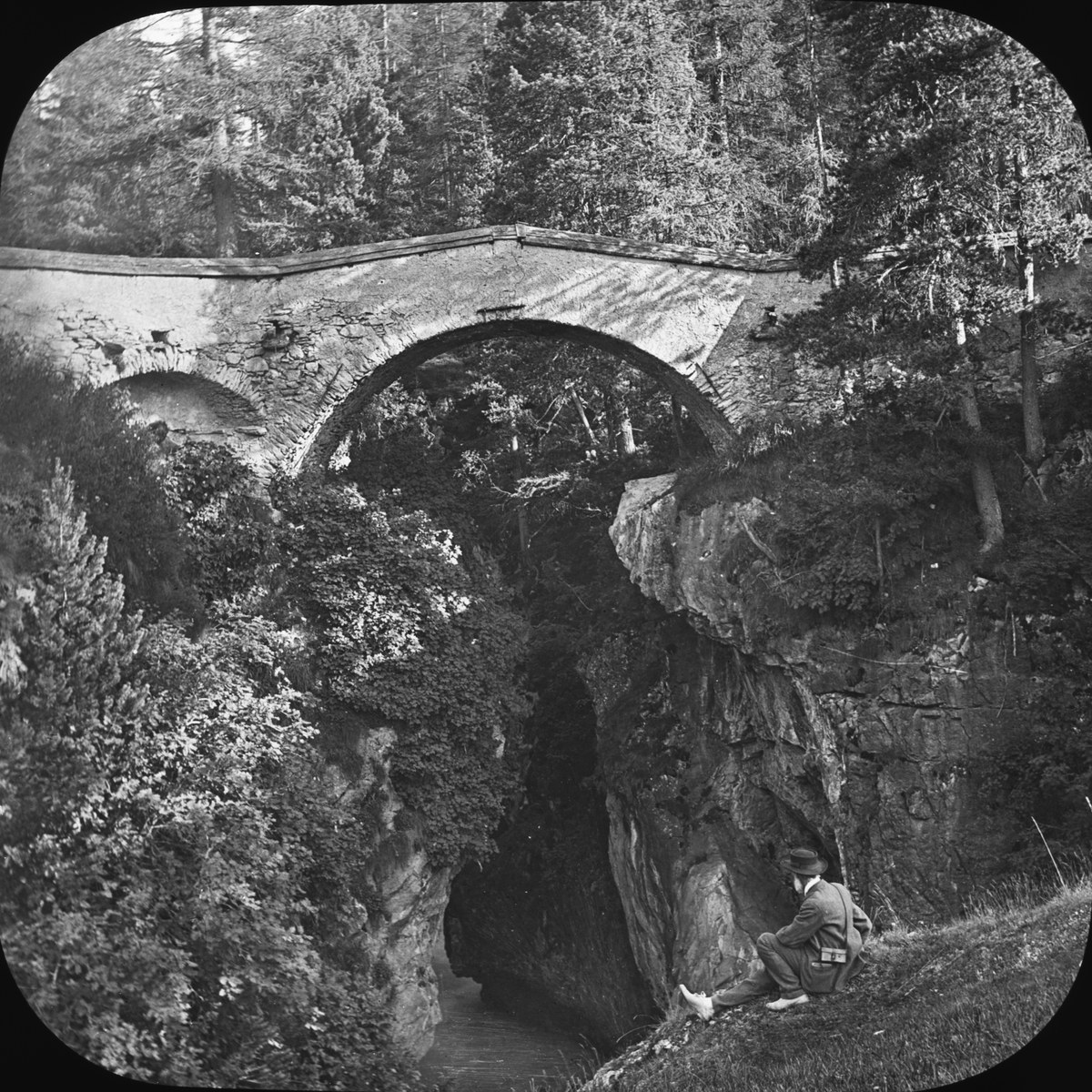 Skioptikonbild. Man på klippa vid okänd valvbro.
