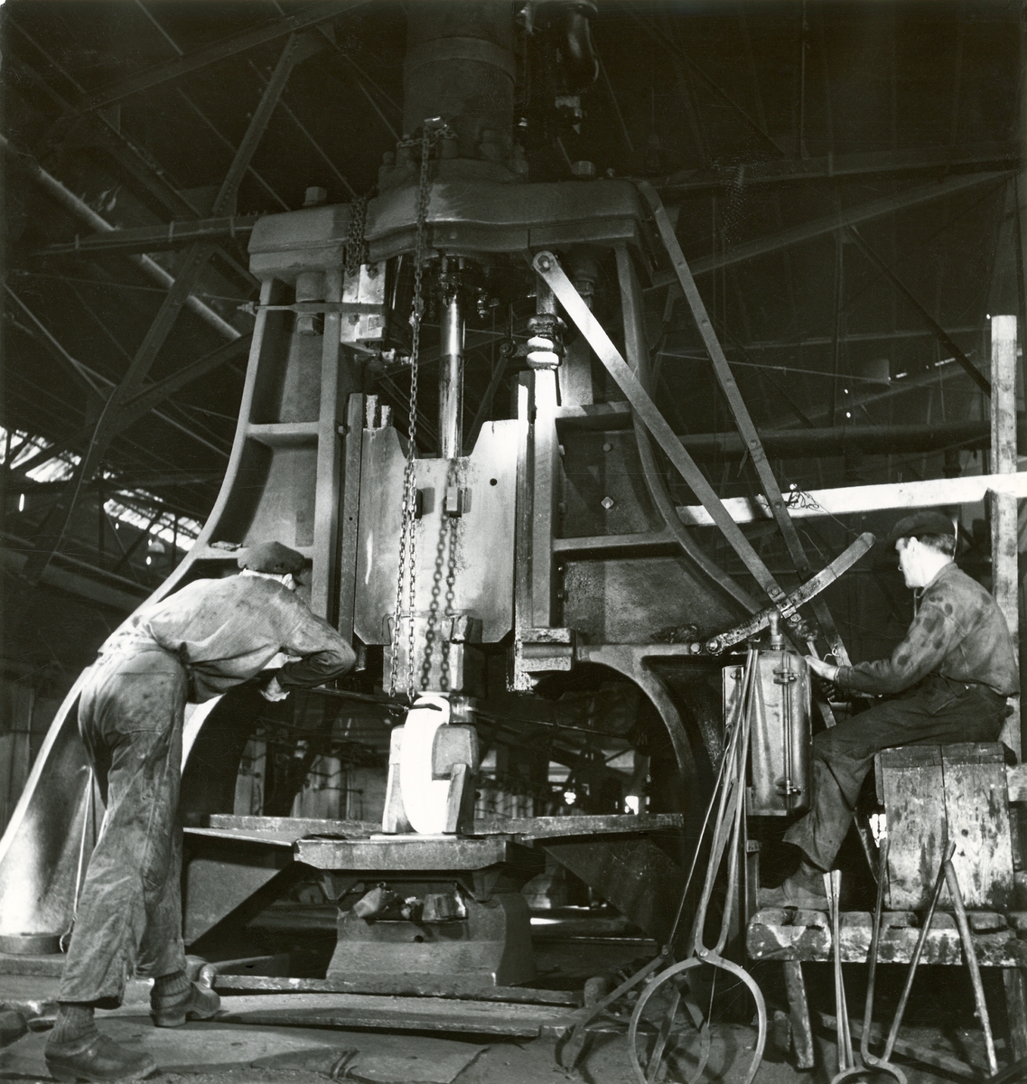 Smidning av ring under lufthammare vid Hofors Järnbruk i Gästrikland.