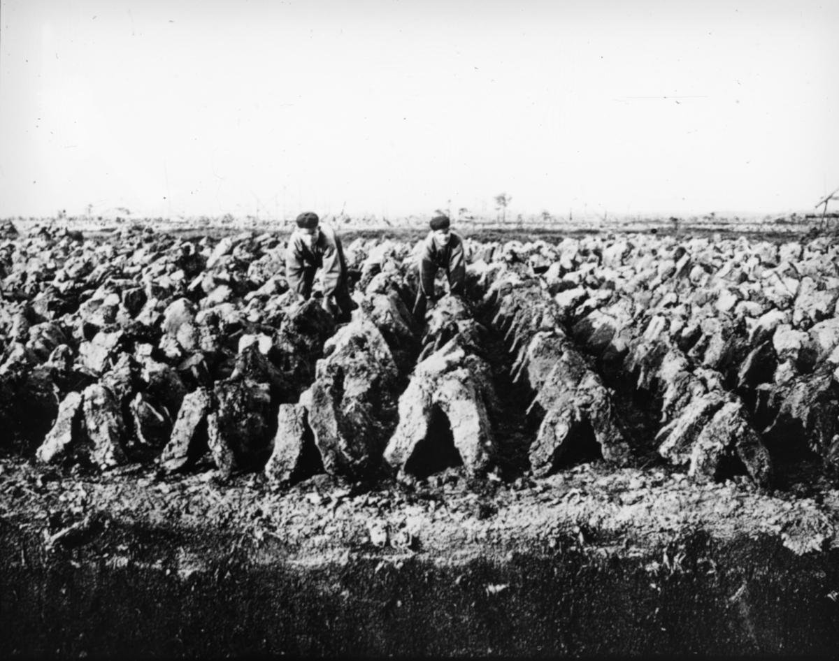Skioptikonbild med motiv av torvtorkning på okänd mosse.