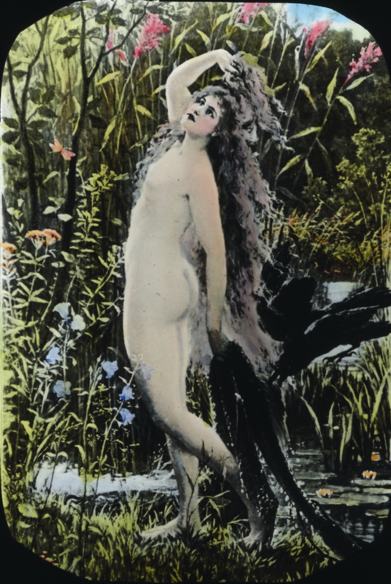 Kolorerad skioptikonbild med motiv av naken kvinna bland blommor.