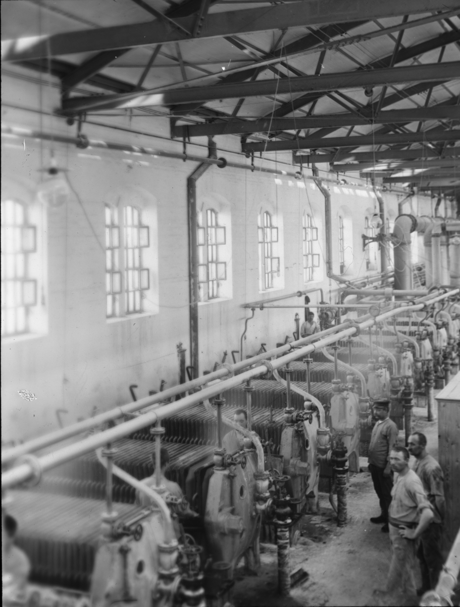 Titel: Skioptikonbild med motiv från yrkesinspektionens undersökningar på olika arbetsplatser. Okänd sockerfabrik. Beredning av sockerbeta.