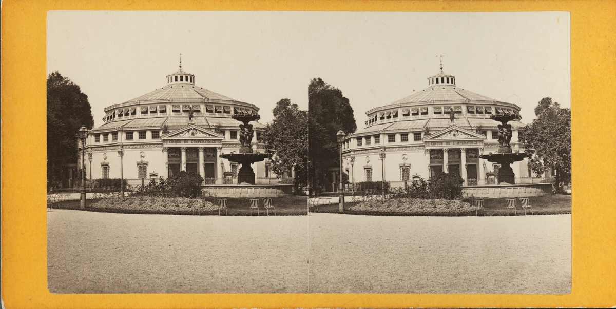 Stereobild med motiv av Cirque de L'impératrice på Champs -Élysées, Paris. Även kallad Cirque d'Hiver. Tetaern förstördes 1902.