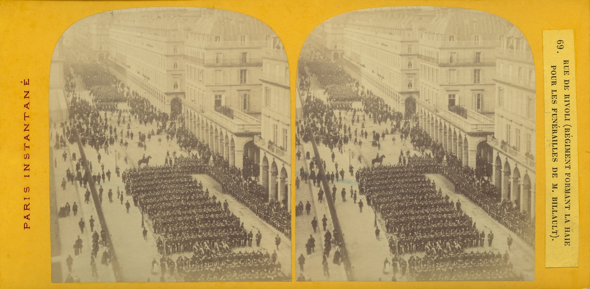 Stereobild med motiv av militärparad längs Rue de Rivoli, Paris.