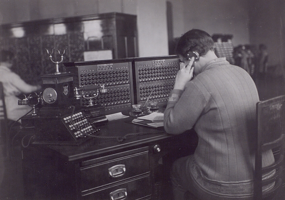 Slottsbacken 8, Skeppsbron. VF-bordet klaffjackstation. Överflyttades senare till Söder och Centralen, vilket arbete var fullbordat i medio av februari 1927.