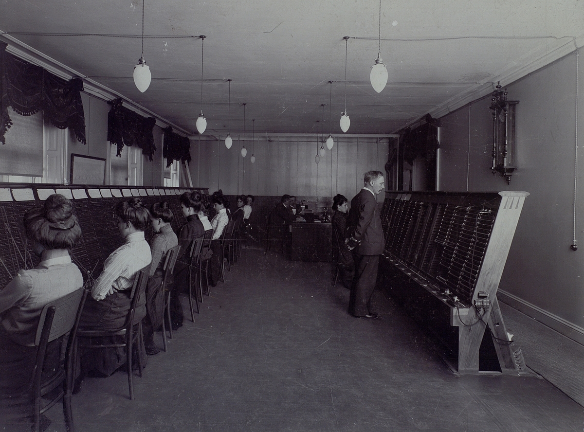Interiör från Stockholms rikstelefonstation år 1902. Fördelningsbord av Avéns konstruktion. Konstruktören själv med på bilden.