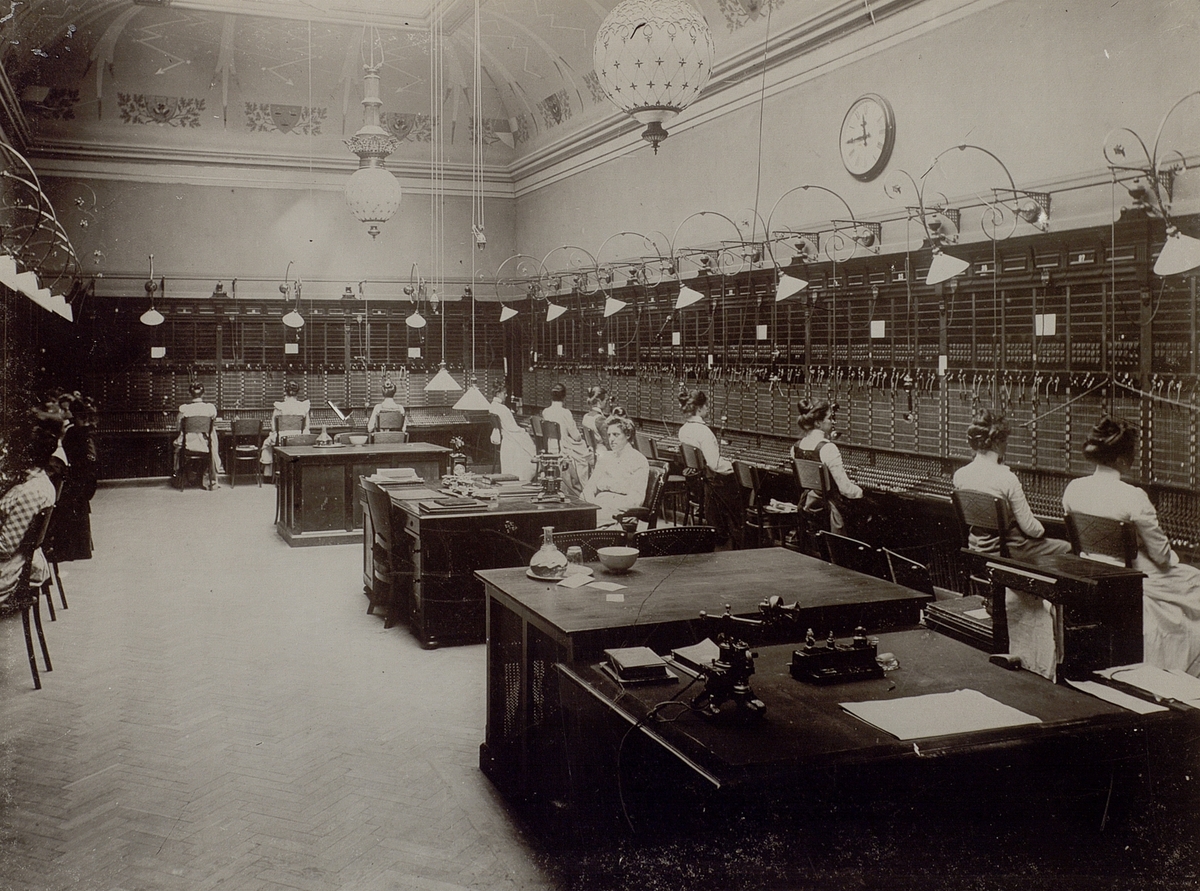 Göteborg telefonstation lokalavdelningen. Interiör. LME, år 1895.