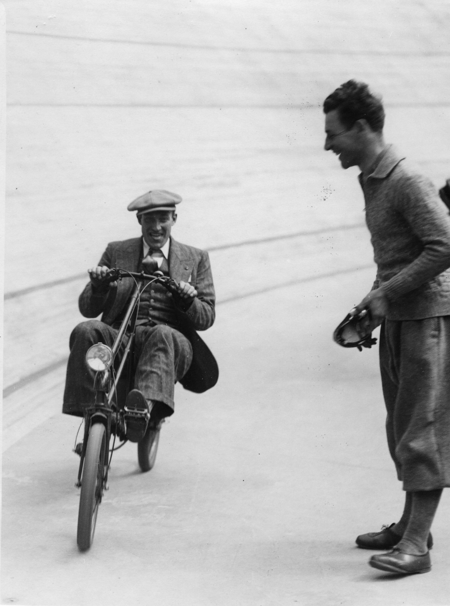 Förberedelserna inför loppet av sex dagars vinterloppet Vel. d'Hiver. Mästare André Leducq provar en av utställningens alla populära unika cyklar, 1930.