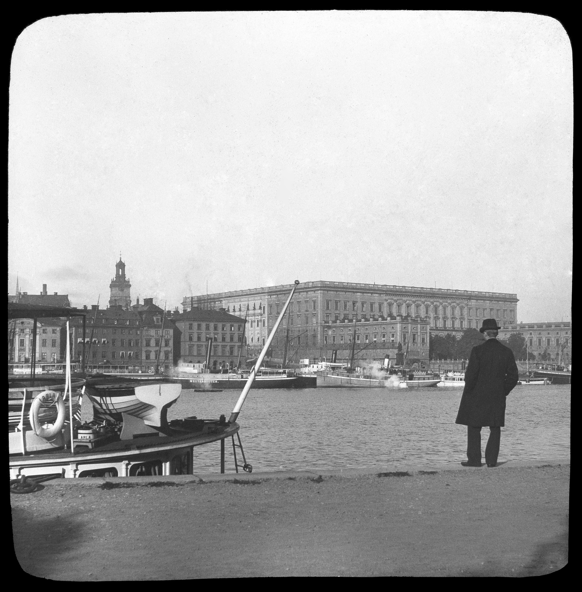 Skioptikonbild med motiv av vy mot Stockholms Slott. Motivet är troligen taget vid tiden för Allmänna Konst- och Industriutställningen i Stockholm 1897.