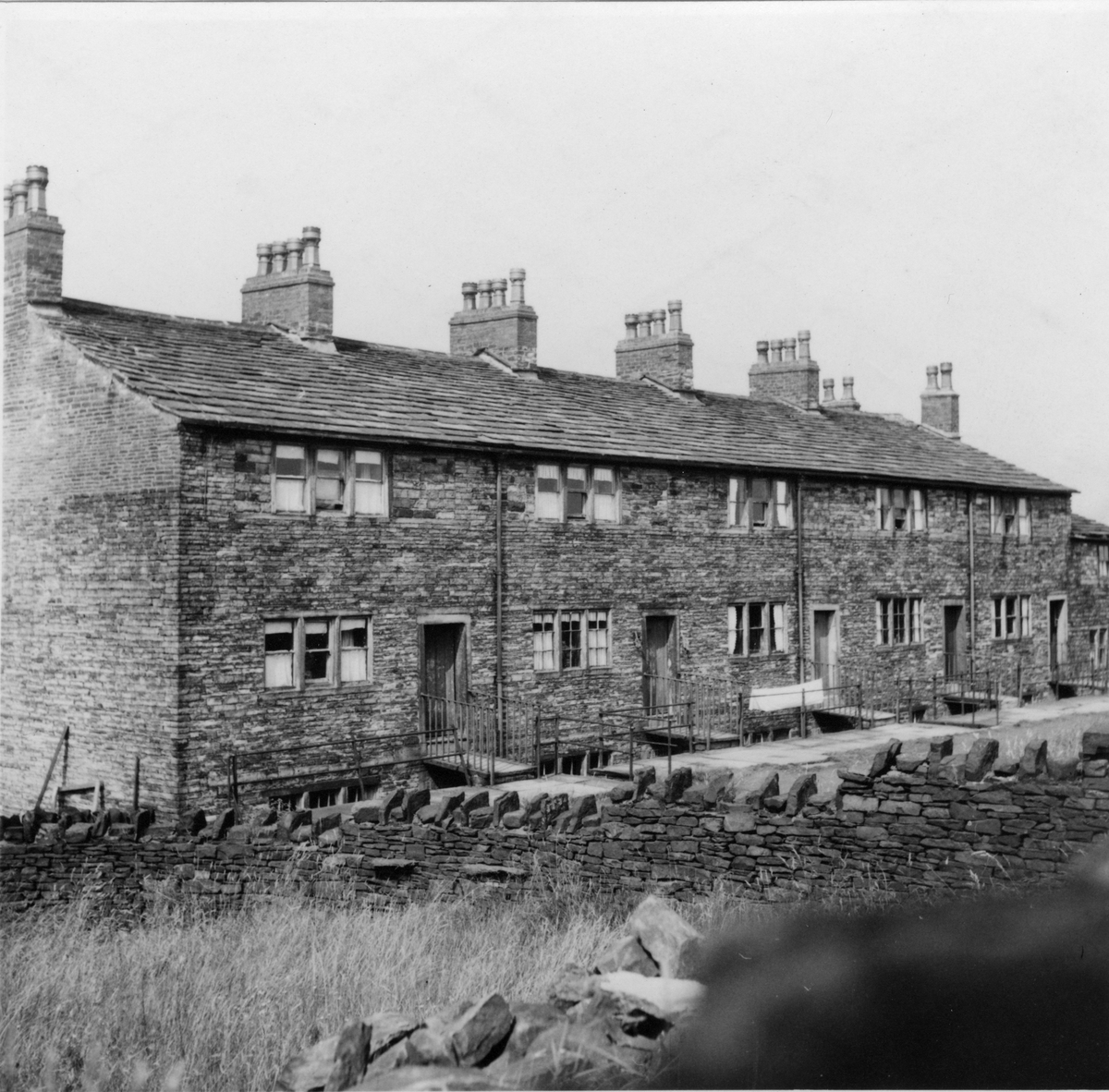 Arbetarbostäder av samma typ som användes under den industriella revolutionens dagar. Bostäder i nedre våningen, vävrum i den övre. Här är de stora fönstren som funnit i vävrummen igensatta. Byggnad nära Oldham, Lancashire, England.