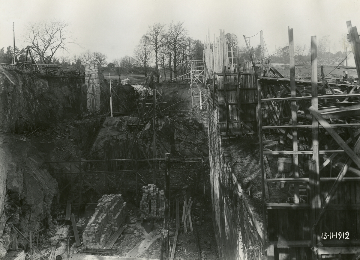 Ombyggnad av Trollhätte Kanal vid Brinkebergskulle sluss, östra muren. 15 november 1912.