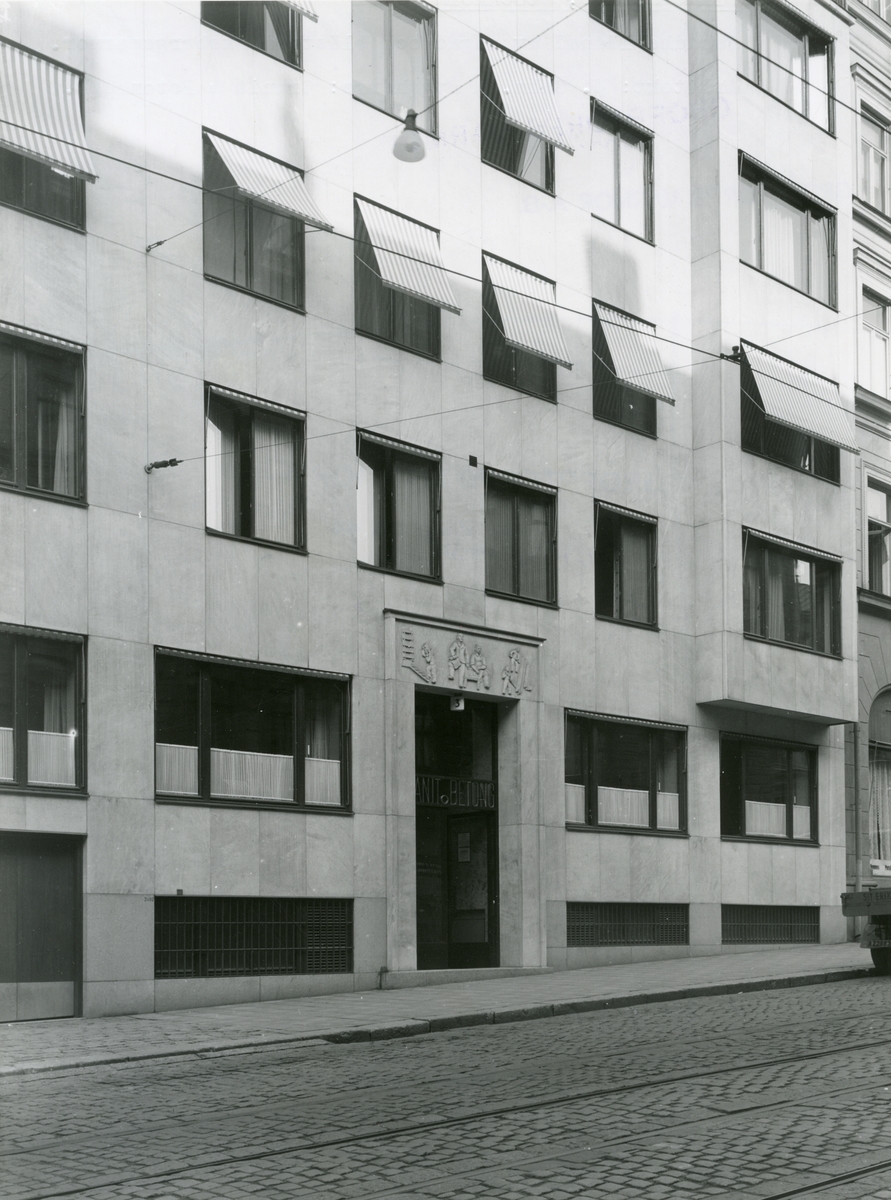Fasadbeklädnad av sågad och blästrad Ekebergsmarmor. Linnegatan 3 i Stockholm 1943.