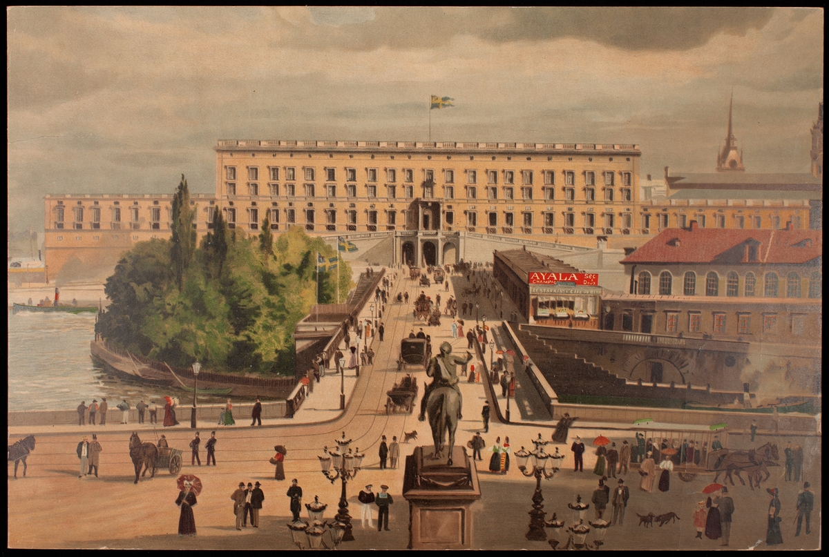 Reklamaffisch. Reproduktion av chromolitografi, s.k. oljetryck. Reklam för Ayalachampagne i början av 1890-talet. Motiv från Stockholm. Vy från Gustav Adolfs torg över Norrbro mot Stockholms Slott.