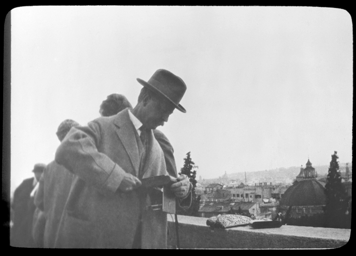 Skioptikonbild från institutionen för fotografi vid Kungliga Tekniska Högskolan. Motiv föreställande man som kontrollerar sin kamera. Bilden är troligen tagen av John Hertzberg under en resa i Europa.