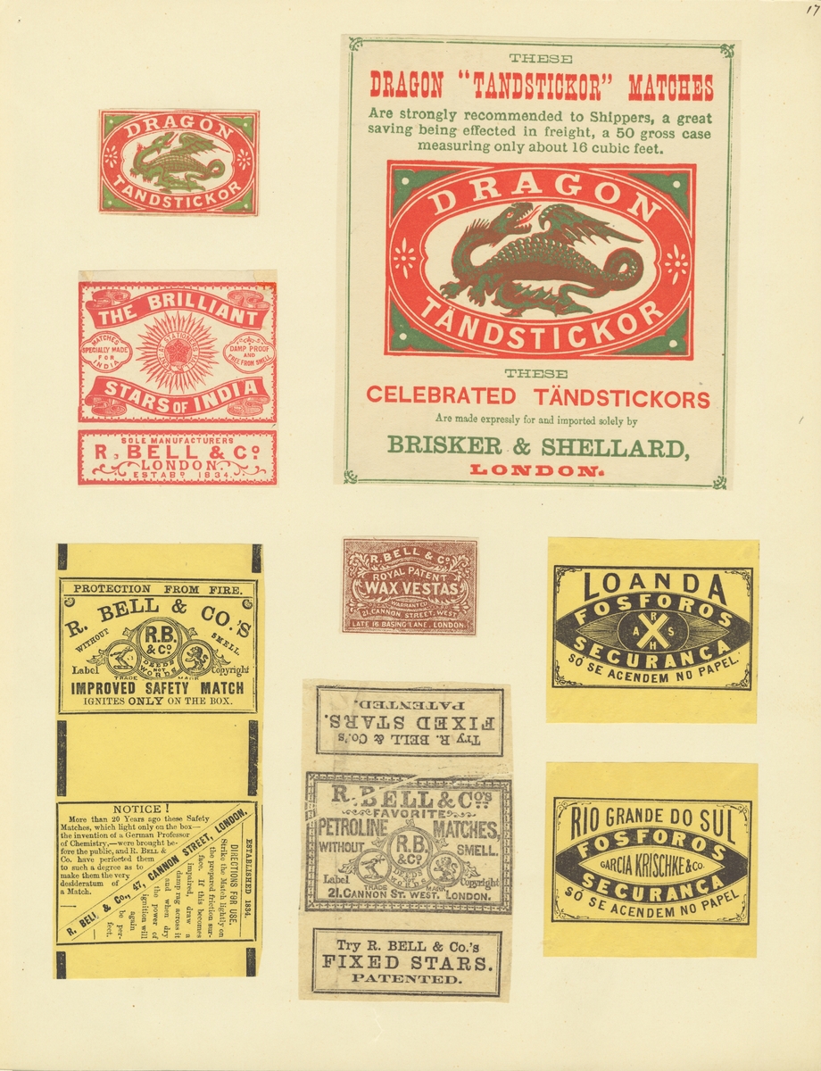 (Dragon Tändstickor, Dragon Matches, The Brilliant Star of India, Loanda, Rio Grand Do Sul), R. Bell & Co, Garcia Krischke & Co).