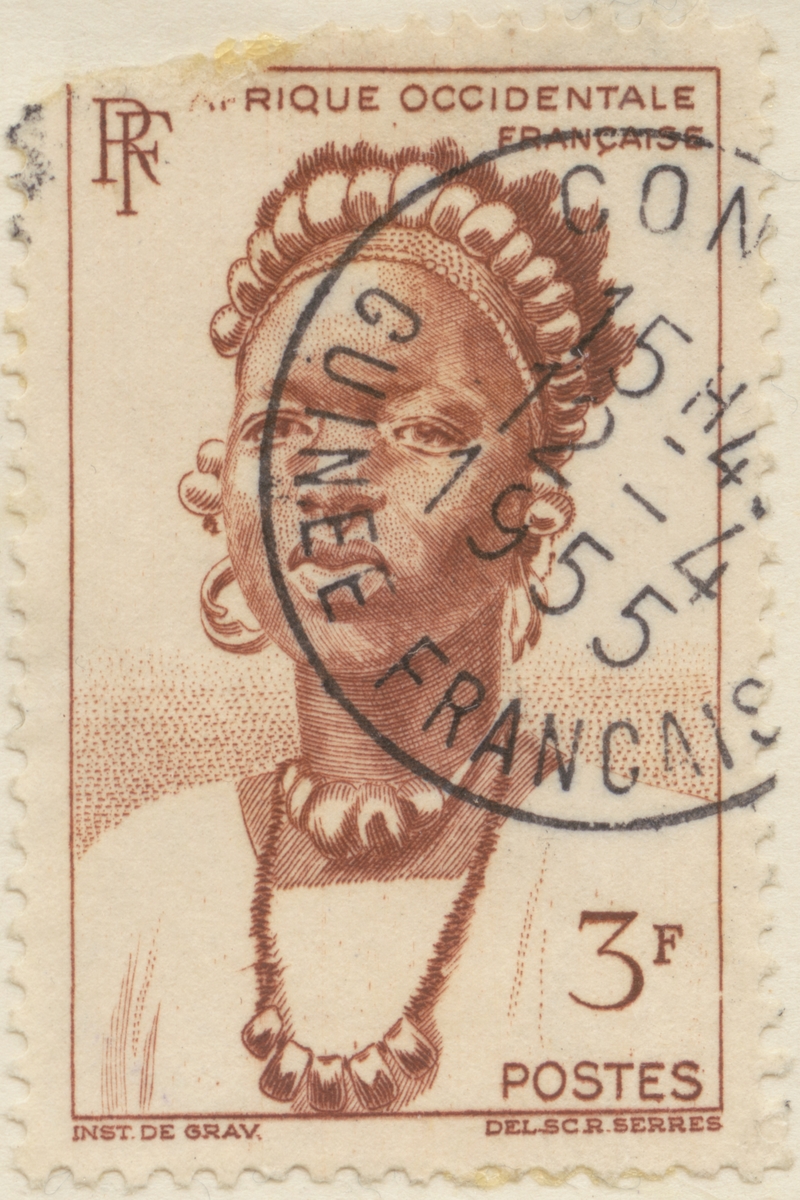 Frimärke från Franska Västafrika, 1947. Motiv av kvinna med huvudbonad och halsprydnader: Djenné (Togo).