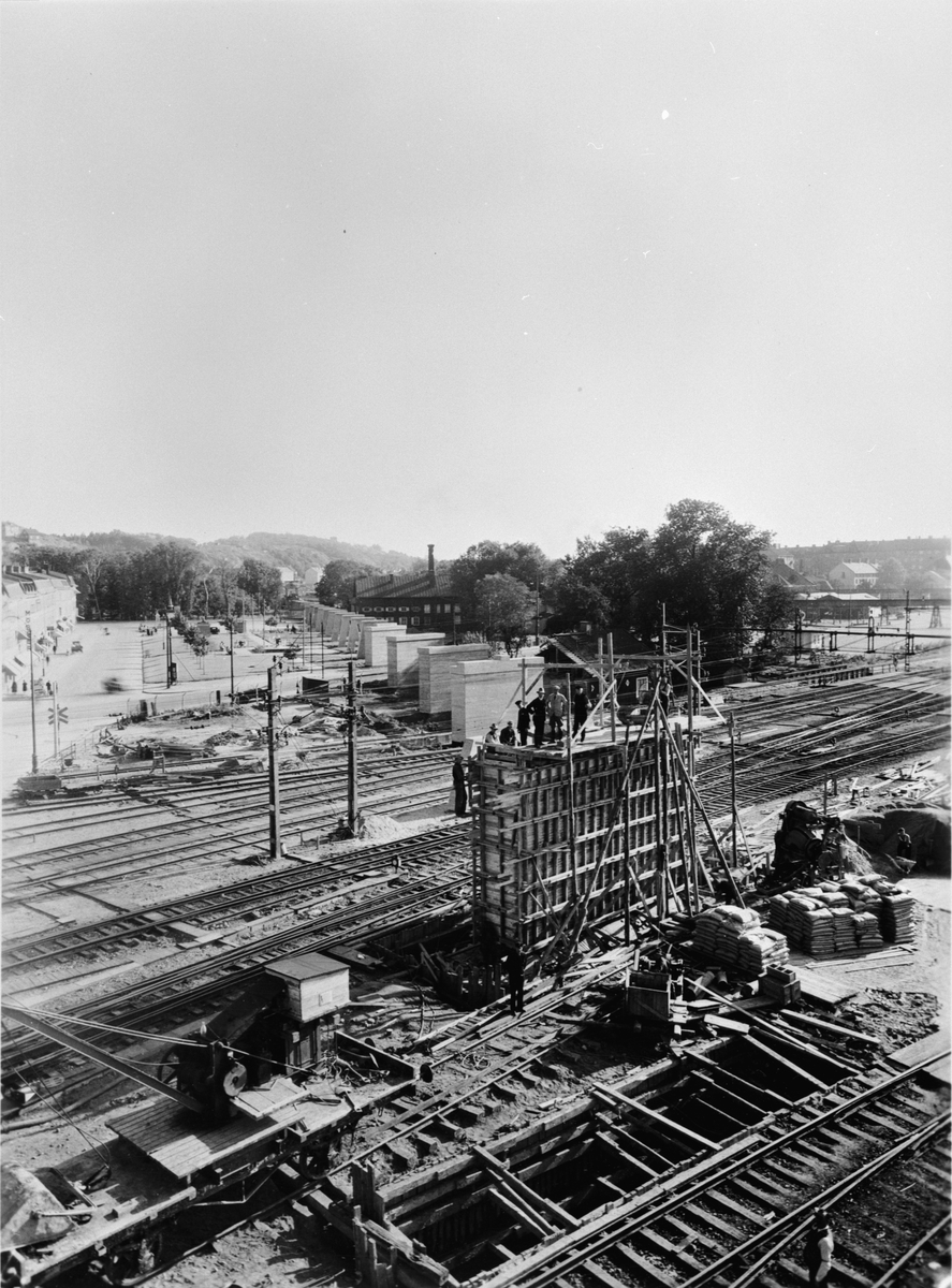 Byggherre: Byggnadsaktiebolaget Contractor, Stockholm. Pelare för SJ:s viadukt över bangården och torget vid Olskroken. Stående på pelaren (i ljus kavaj) civilingenjör Fredrik Ekström, då posthavande ingenjör.