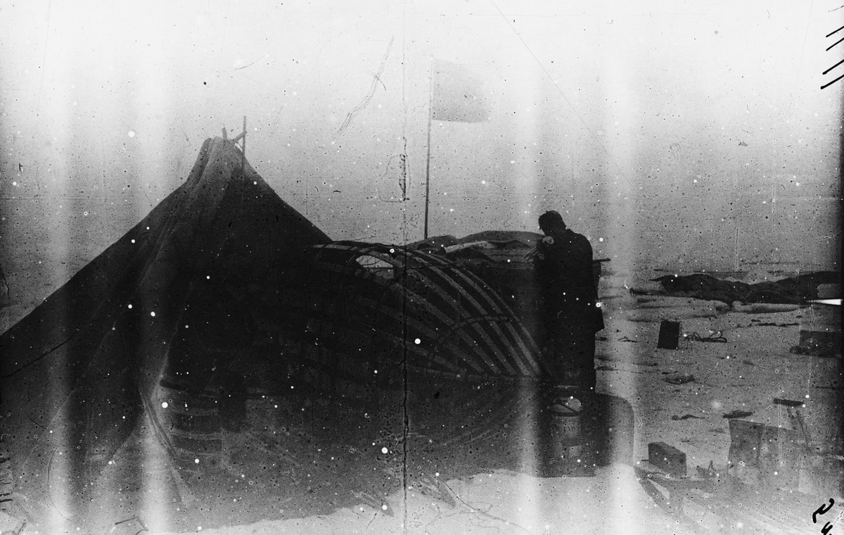 Den 15 - 19 juli 1897. Lägret vid "Örnens" landningsplats. Arbete med montering av båtens stomme. Framtagning av bilderna gjordes av docent John Hertzberg år 1930 på Fotografi, Tekniska Högskolan.