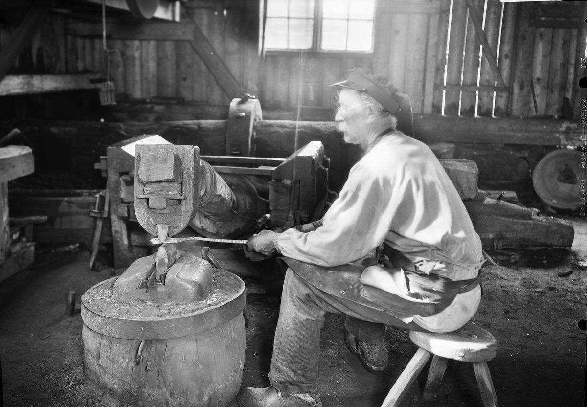 Lilla smedjan. Smeden John Dahlgren, född 1866, smider ut ett lie-ämne under en vattenhjulsdriven hammare.