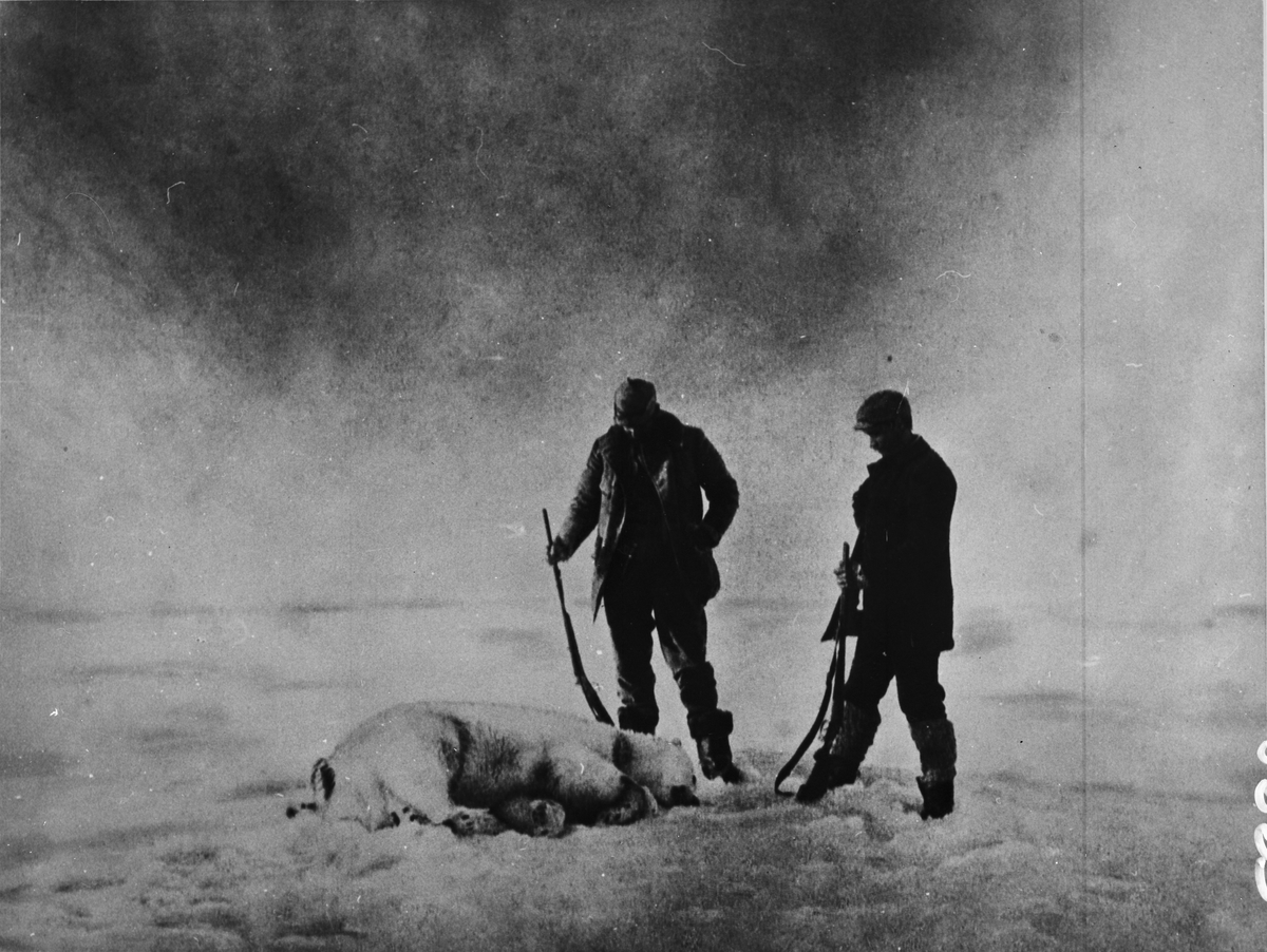 Ett välkommet byte (isbjörn). Till vänster Fraenkel och till höger Strindberg. Framtagning av bilderna gjordes av docent John Hertzberg år 1930 på Fotografi, Tekniska Högskolan.