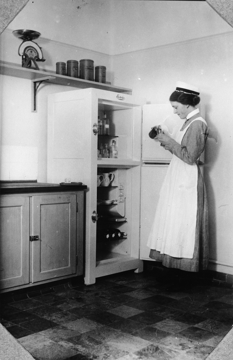 Installation av Elektrolux kylskåp, öppet, i Norrköpings lasarett. En sjuksköterska i bilden.