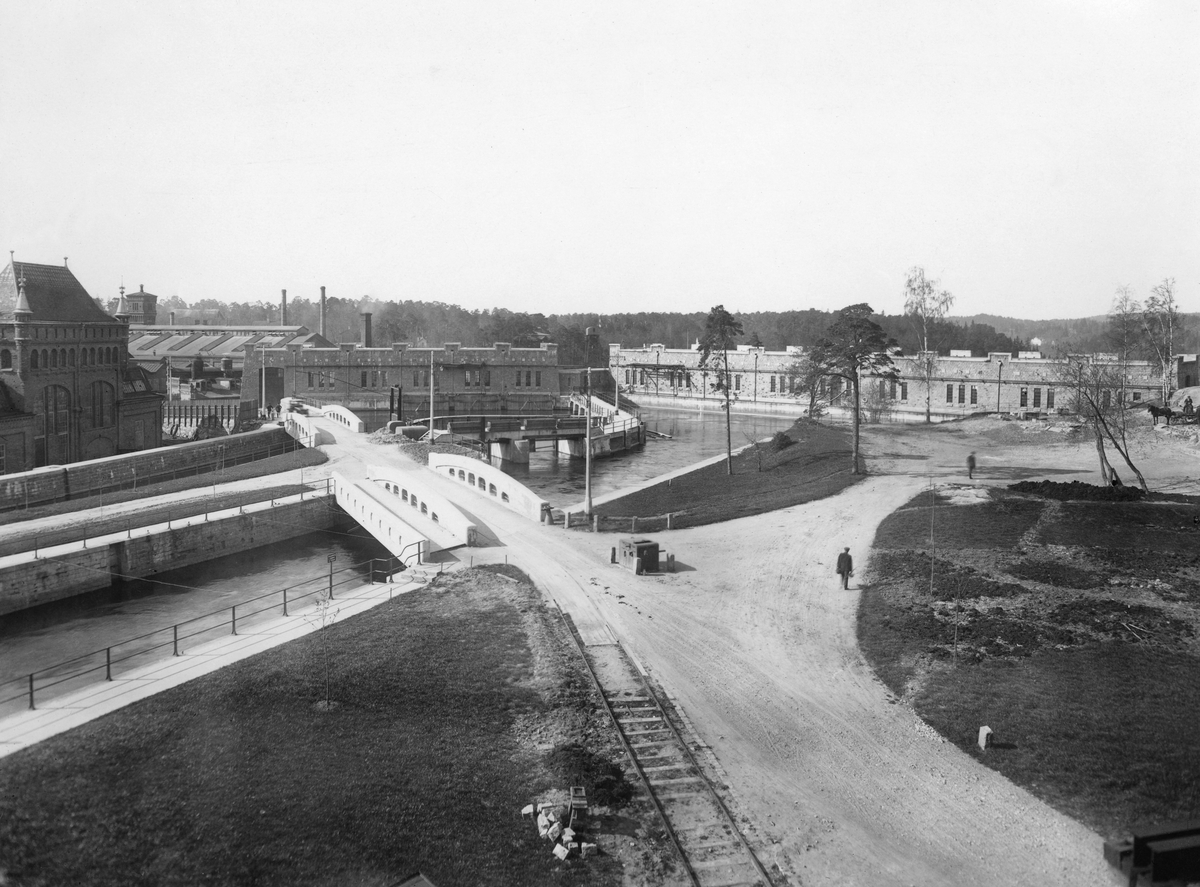Trollhätte kraftverk. Kraftkanalen med fördelningsbassängen samt tubintagsbyggnaden.