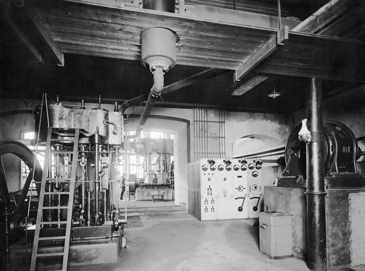 Elektrisk belysning allmänt. Ångelektricitetsverk. T v två ångmaskiner och t h en Wenströmsmaskin.