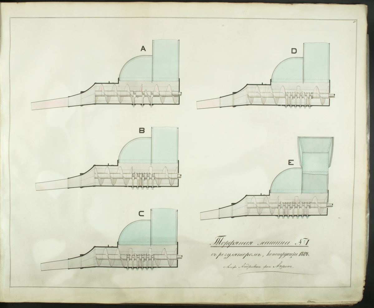 Skiss på ryska 1884, ur boken med ritningar mm 1868-1887, av den svenske torvmaskinkonstruktören Aleph Anrep.