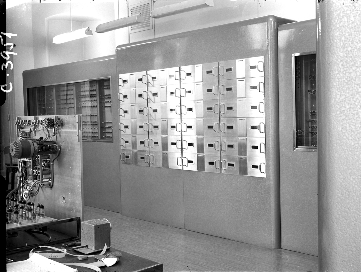 Dokumentation av byggandet av matematikmaskinen BESK på Drottninggatan i Stockholm. Stativ med Williamsminnen. Till vänster i förgrunden syns hålremsstansen. Till höger i förgrunden syns stativet till kraftförsörjningsaggregatet.