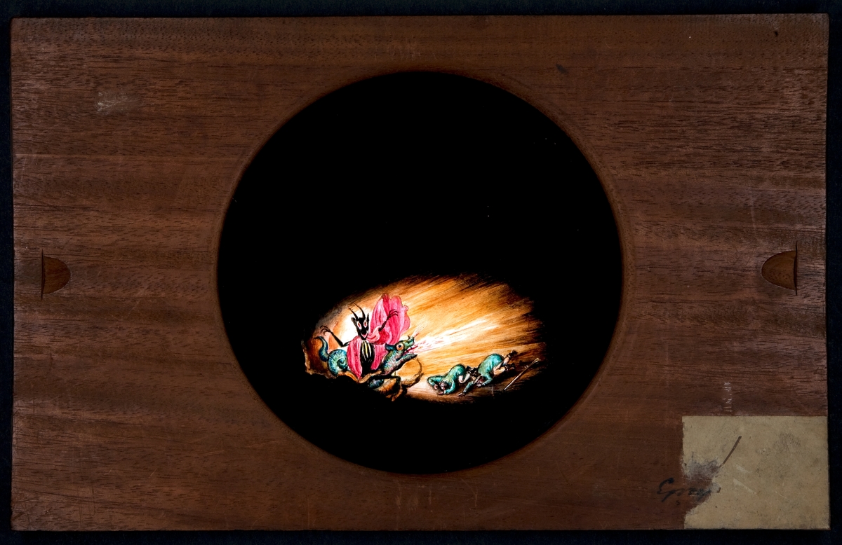 Laterna magica bild målad i färg på glasskiva. "Friskÿtten".