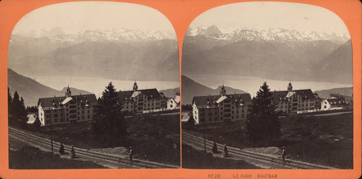 Stereobild, vy över Rigi Kaltbad, män och kvinna på räls invid.