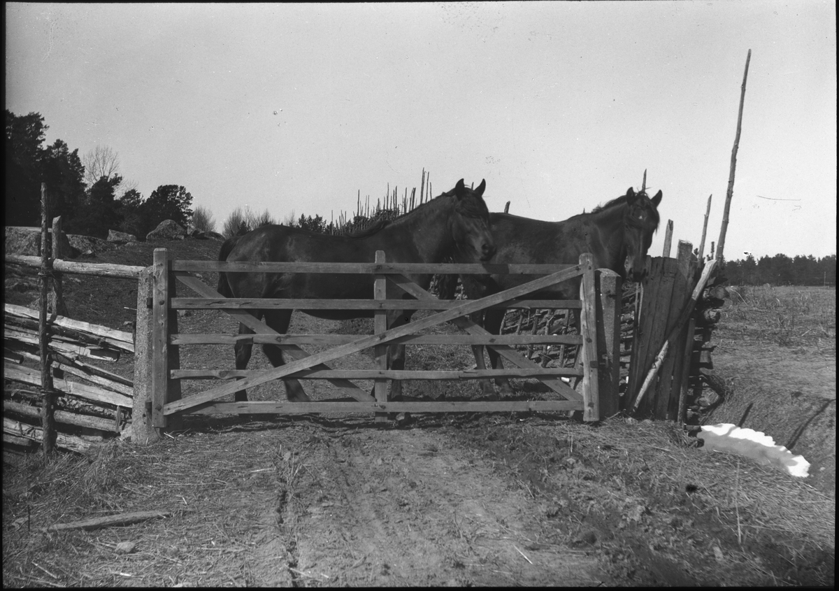 Diapostiv, fönsterbild, hästar i hage vid grind.