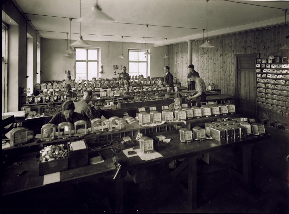 Arbetare i verkstaden vid Fabriks AB Haldataxametern, Halmstad.