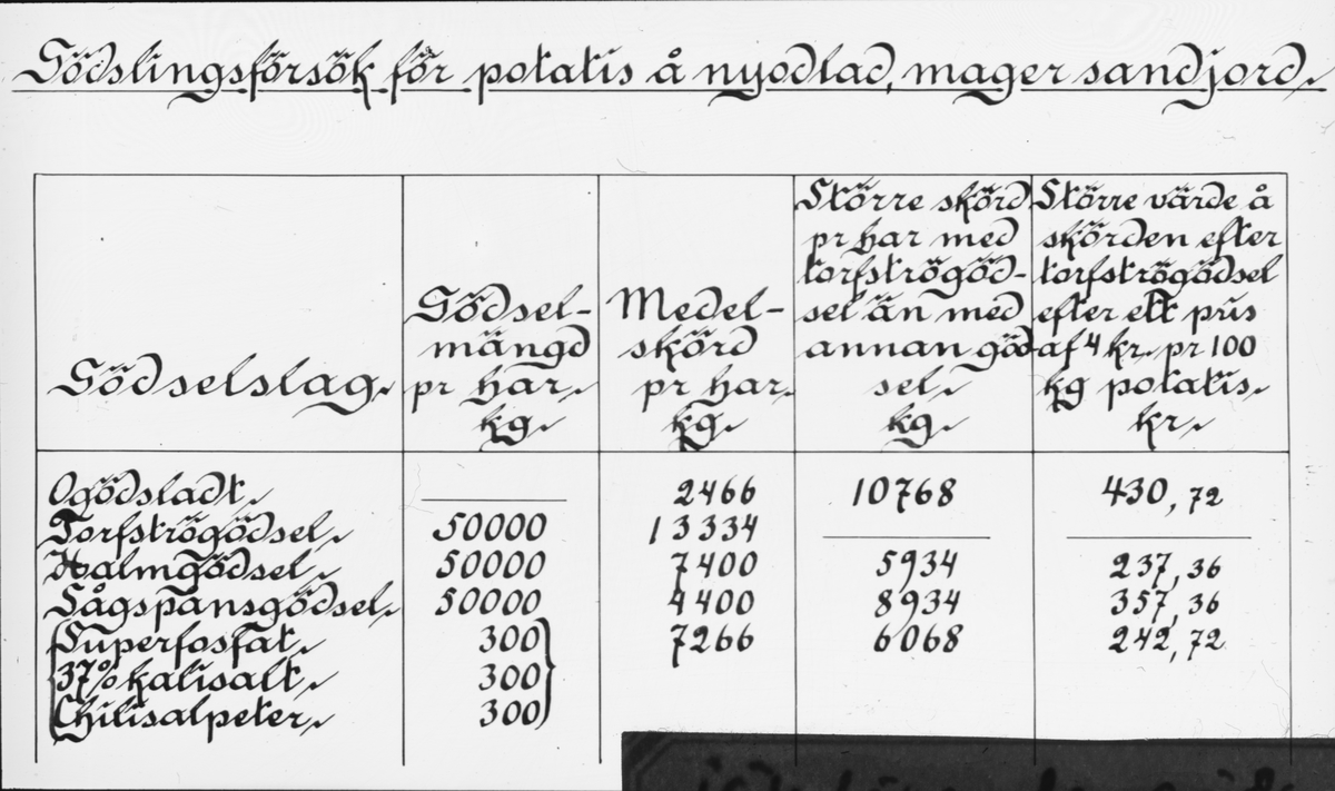 Skioptikonbild. Tabell över gödslingsförsök på potatis å nyodlad, mager sandjord.