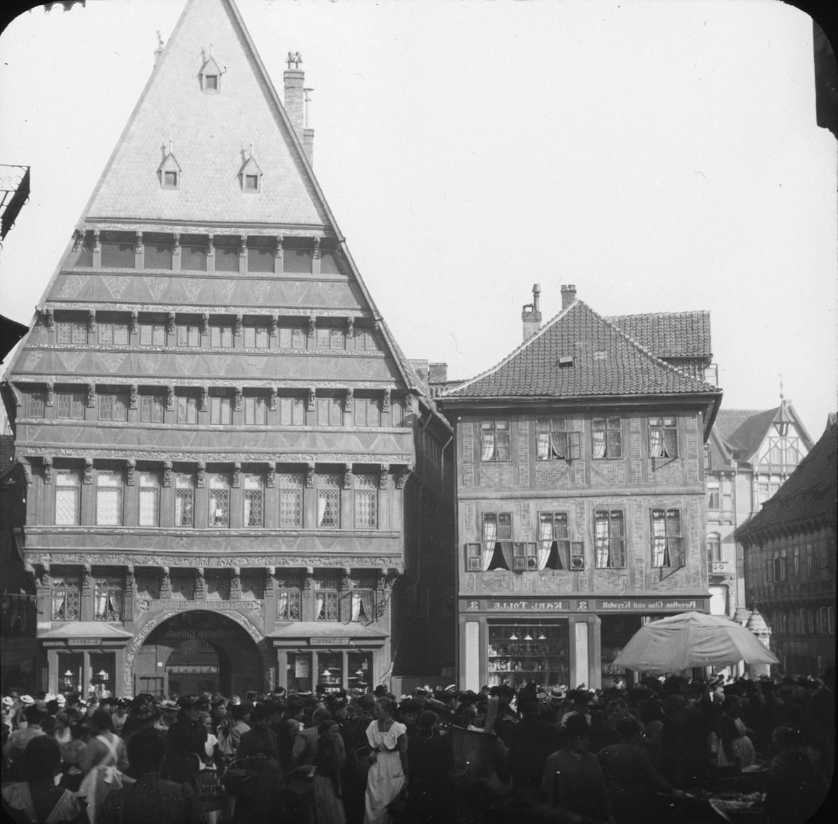 Skioptikonbild med motiv markad på torget i Hildesheim, framför Pfleiderhaus.